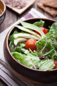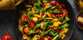 Wok stir fry vegetables with zucchini, spring asparagus, paprika, carrot and broccoli, closeup in a wok pan in a kitchen