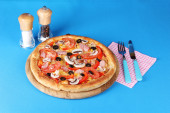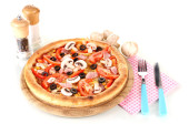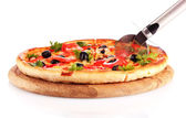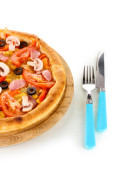 aromatyczna pizza z widelcem i nożem na białym tle