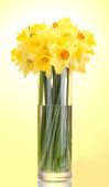 piękne żółte żonkile w przezroczyste wazy na żółtym tle
