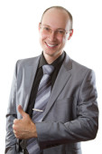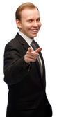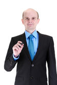 działalności człowieka w garniturze, wskazując na ekranie na białym tle