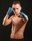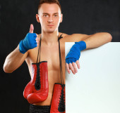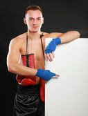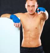 Młody przystojny bokser człowiek stojący w pobliżu zarządu i wskazując na Ciebie, na białym tle na czarnym tle