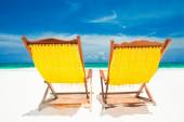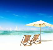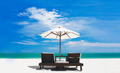 panoramiczny widok ow tropikalnej plaży parasol i 2 łóżka