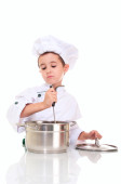 śmiejąc się mały chłopiec kucharz z patelni w ręce