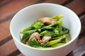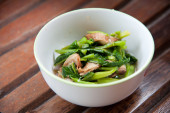 ziela-białe i kolorowe warzywa smażone wymieszać okrągłe miski na wzór drewna