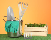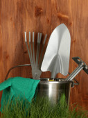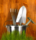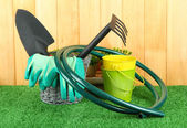 narzędzia ogrodowe na trawnik na tle drewniane z bliska