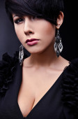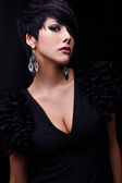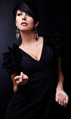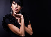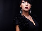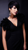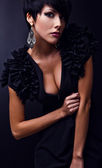 Piękna kobieta na czarnej klasycznej pozycji sukienki w studio.