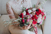 Wedding. Bouquet. Bride. Grain. Artwork. The bride in a white dress sitting on the couch and holding a bridal bouquet of red flowers, white flowers and greenery