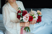 Zdjęcie "Wedding. Bouquet. Bride. Grain. Artwork. The bride in a white dress sitting on the couch and holding a bridal bouquet of red flowers, white flowers and greenery" może być wykorzystywane do celów osobistych i komercyjnych zgodnie z warunkami zakupionej licencji Royalty-free. Obraz jest dostępny do pobrania w jakości wysokiej rozdzielczości do 5760x3840.