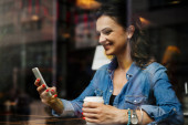 Zdjęcie "Ładna kobieta z ładny uśmiech co samo zdjęcie na jej silny telefon podczas odpoczynku w kawiarni " może być wykorzystywane do celów osobistych i komercyjnych zgodnie z warunkami zakupionej licencji Royalty-free. Obraz jest dostępny do pobrania w jakości wysokiej rozdzielczości do 5760x3840.