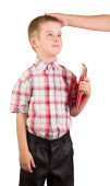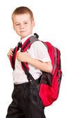 Uczniowie zbierają plecak do szkoły na białym tle.