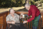 zarośnięty średniej wieku człowiek w kwiatowy koszula mężczyzna