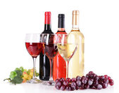 butelki i kieliszków wina i dojrzałych winogron na białym tle