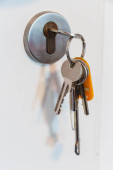 Zdjęcie "Blokada drzwi z klawiszy makro strzał - pojęcie nieruchomości" może być wykorzystywane do celów osobistych i komercyjnych zgodnie z warunkami zakupionej licencji Royalty-free. Obraz jest dostępny do pobrania w jakości wysokiej rozdzielczości do 5760x3840.