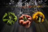 Zdjęcie "3 papryki wpadnięciem do wody. niebieskim tle" może być wykorzystywane do celów osobistych i komercyjnych zgodnie z warunkami zakupionej licencji Royalty-free. Obraz jest dostępny do pobrania w jakości wysokiej rozdzielczości do 5760x3840.