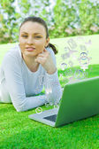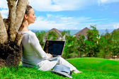 dorosła kobieta siedzący pod drzewem na zielonej trawie i komunikacji