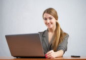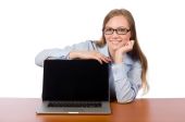 zachwycony 20s pracy przy biurku z zadowoleniem dziewczynka