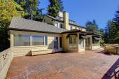 Małych amerykańskich domu z zewnątrz światła i duże trawy wypełnione trawnik
