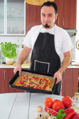 Szef kuchni cięcia świeżo przygotowaną pizzę na podłoże drewniane.
