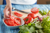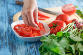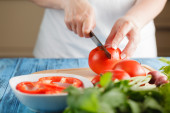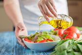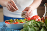 zbliżenie na kobieta dodając świeży koperek do sałatki