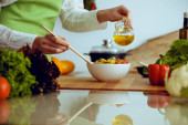zbliżenie na kobieta dodając świeży koperek do sałatki