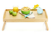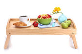 lekkie śniadanie na drewnianej tacy na białym tle