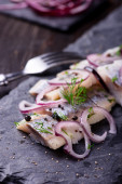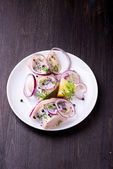 Śledzie z pieprzem, ziołami, solą i cytryną na biały ceramicznych plat