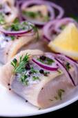 Śledzie z pieprzem, ziołami, solą i cytryną na biały ceramicznych plat