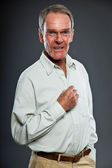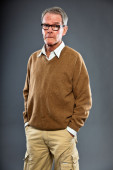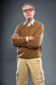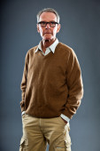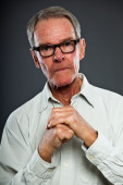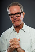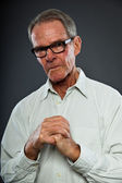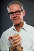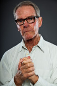ekspresyjny dobry patrząc starszy człowiek w okularach ścianę szary. ręce modląc się. duchowe i charakterystyczne. dobrze ubrany. łapka.