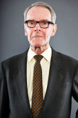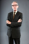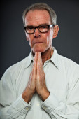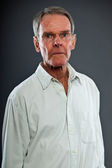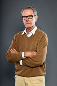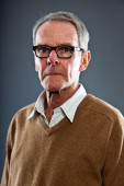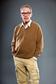 ekspresyjny dobry starszy mężczyzna w okularach szarej ścianie. zabawny i charakterystyczne. dobrze ubrany. łapka.