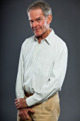 Ekspresyjnie przystojny starszy pan pod szarą ścianą. Śmieszne i charakterystyczne. Dobrze ubrany. Zdjęcia studyjne.
