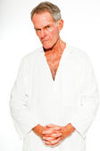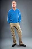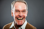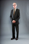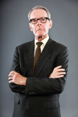 Ekspresyjnie przystojny starszy pan pod szarą ścianą. Śmieszne i charakterystyczne. Dobrze ubrany. Zdjęcia studyjne.