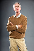 ekspresyjny dobry starszy mężczyzna w okularach szarej ścianie. zabawny i charakterystyczne. dobrze ubrany. łapka.