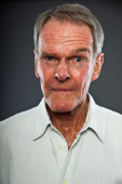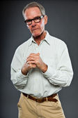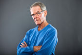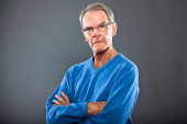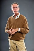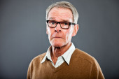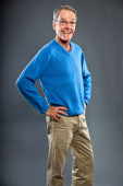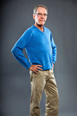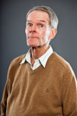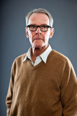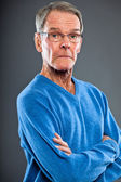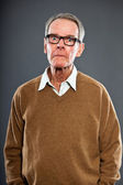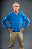 wyraziste, dobrze wyglądający starszy człowiek ścianę szary. zabawny i charakterystyczne. dobrze ubrany. niebieski sweter. łapka.