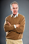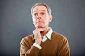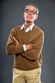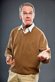 ekspresyjny dobry starszy mężczyzna w okularach szarej ścianie. zabawny i charakterystyczne. dobrze ubrany. łapka.
