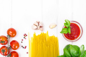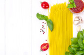 Bazylia, czerwony pomidor z makaron na białym tle Woody