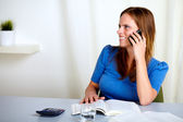 piękny ładna kobieta uśmiechając się i mówiąc na telefon
