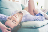 Szczęśliwa młoda kobieta, leżąc na kanapie i relaks w domu. Styl casual strzelać kryty
