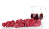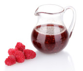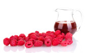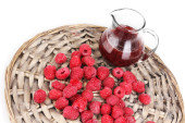 maliny w metalowe wiadro i dzbanek z dżemem na białym tle