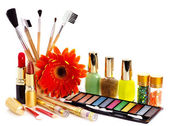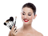 dziewczynka gospodarstwa pędzlem cień do powiek i makijaż.