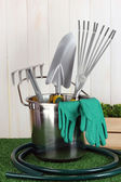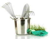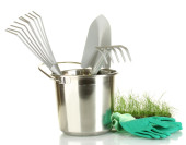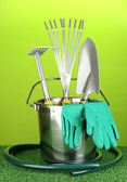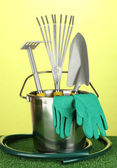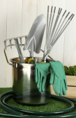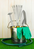 narzędzia ogrodowe na trawnik na jasne kolorowe tło zbliżenie
