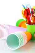 jasne plastikowe naczynia jednorazowe na drewnianym stole na kolorowe tło