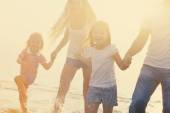 Szczęśliwe rodziny młodych zabawy działa na plaży o zachodzie słońca