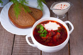 ukraiński i rosyjski krajowych czerwone zupa barszcz na drewnianej tacy. zbliżenie