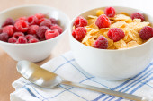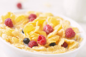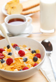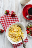 płatki kukurydziane, truskawki, mleko i filiżankę kawy na śniadanie