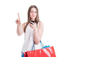 Piękna Pani shopper patrząc na telefon i uczucie splątania