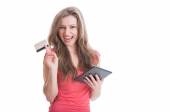 Piękny woman twarz z zadaszonym usta kartą debetową