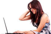 Ładna kobieta głęboko w myślach patrząc na laptopa