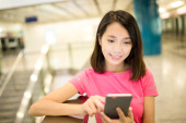 Kobieta przy użyciu telefon w środku centrum handlowego