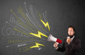 Biznes człowiek stojący z parasolem i wyciągnięte strzały uderzające go