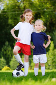 Śmieszne, mała dziewczynka, wspieranie w piłce nożnej